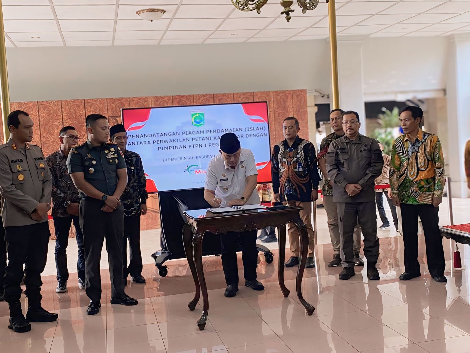 Dandim 0818/Kabupaten Malang-Batu Letkol Inf Yuda Sancoyo, M.Han. bersama Forkopimda Kabupaten Malang menghadiri kegiatan Penandatanganan Perdamaian (Islah) antara dua kelompok yakni antara perwakilan Petani Kalibakar dengan Pimpinan PTPN 1 Regional 5. Kegiatan ini dilaksanakan di Pendopo Agung Kab. Malang Jl. KH. Agus Salim No. 07 Kota Malang. Kamis (4/04/2024)