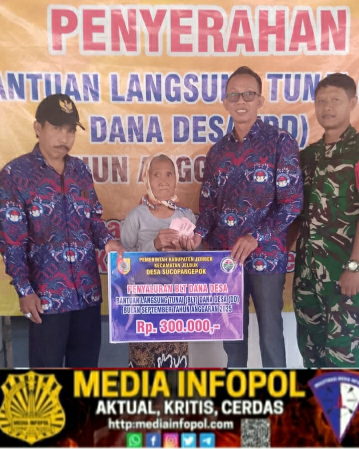 Pemerintah Desa Sucopangepok, Kecamatan Jelbug, Kabupaten Jember, melaksanakan penyaluran Bantuan Langsung Tunai (BLT) tahap 2 bulan 6,7 & 8 secara langsung di Balai Desa pada Kamis (2/10/2025). Kegiatan ini bertujuan untuk memberikan dukungan ekonomi kepada masyarakat yang terdampak, dengan jumlah penerima mencapai 40 KK (keluarga) yang telah terdaftar dalam program bantuan pemerintah.
