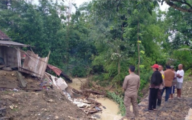 Akibat kejadian tersebut, salah satu bangunan rumah milik Lastri, bagian dapur terdampak longsor.