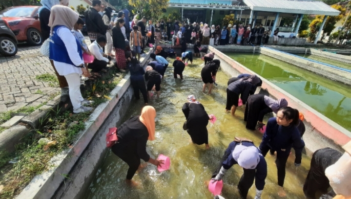 Para ibu memegang alat ceting wakul nasi berkat yang disediakan panitia, untuk menangkap ikan nila. Dengan penuh semangat dan sorak sorai penyemangan dari pengunjung, para ibu berusaha menangkap ikan.
